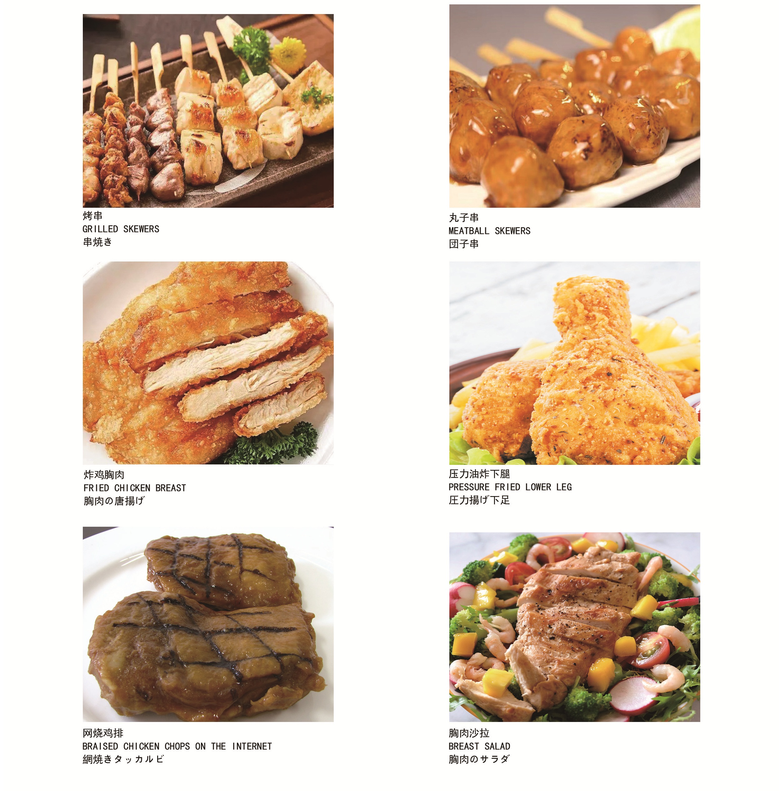 焼き鳥スチーム、竜田揚げ、唐揚げ、チキンリングなど、豊富なバリエーションをご用意しております。また、お客様のご要望に合わせたオリジナル加工品の製造も可能です。
